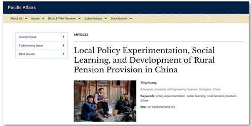 政策创新、地方试验与政策扩散是当代经济学、公共管理学、政治学的前沿研究领域。中国的地方政策试验和经验推广近年来受到学界越来越多的关注并被认为是推动中国发展奇迹的重要制度基础。但是,中国的社会保障领域中的政策创新机制是怎样的?政策相关主体间的互动如何影响地方政策试验的建立、扩散以及这个过程中的政策演变?学界对这些问题的关注仍然有限。beat365亚洲体育官方网站黄婷博士近期在SSCI期刊Pacific Affairs(《太平洋事务》)发表独著论文,揭示了中国新型农村社会养老保险地方政策创新和政策演变中的社会学习机制。