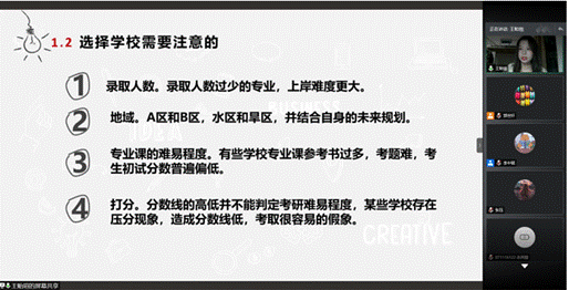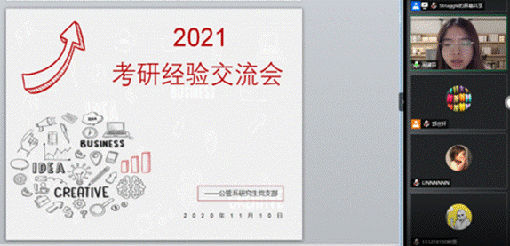 11月10日,beat365亚洲体育官方网站研究生第七和第八党支部在腾讯会议上举办了考研经验交流会,五位20级公管系研究生李晓天、邬庆超、索梦慧、张媛媛和王贻瑄,通过将把自己的考研经验倾囊相授,为备考本科生奉上了一次交流盛宴。出席本次交流会的有公管系研究生辅导员周淑芬、20级公管系研究生和大三大四考研同学,活动由20级公管系研究生李中钺主持。