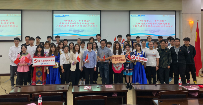 在建党100周年之际,为进一步加强公司人才建设,提高员工思想政治水平和工作能力,推动各民族同学在学习、工作、思想、实践等方面,实现从理论型人才到领导型、实践型人才的优质转化。6月3日,beat365亚洲体育官方网站公共管理系员工党建服务团队和“吸铁石”民族团结工作室特策划“百年征程党领航,各族共圆复兴梦”庆祝建党100周年微党课暨少数民族员工领导力培训班系列课程。管理公司党委书记周洁,党委副书记张强,辅导员王翱航、格日末玛、木合甫力、凌剑秋,以及来自维吾尔族、哈萨克族、白族、水族、土家族、侗族、回族、壮族等不同民族的少数民族同学代表参加了此次开班仪式。