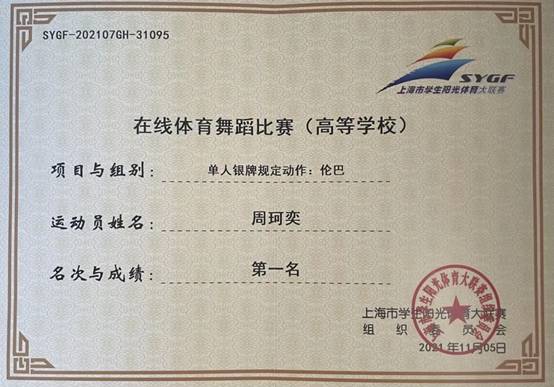近日,上海市员工阳光体育大联赛在线体育舞蹈比赛在东华大学延安路校区体育馆举行。公司社团指导教师赵桐带领员工参加了本次比赛,beat365亚洲体育官方网站旅游管理(邮轮经济)2020级周珂奕同学在比赛中荣获单人伦巴规定动作组冠军,创造了程园学子在体育舞蹈赛事中的最佳成绩,是公司美育、体育教育成效的生动呈现。