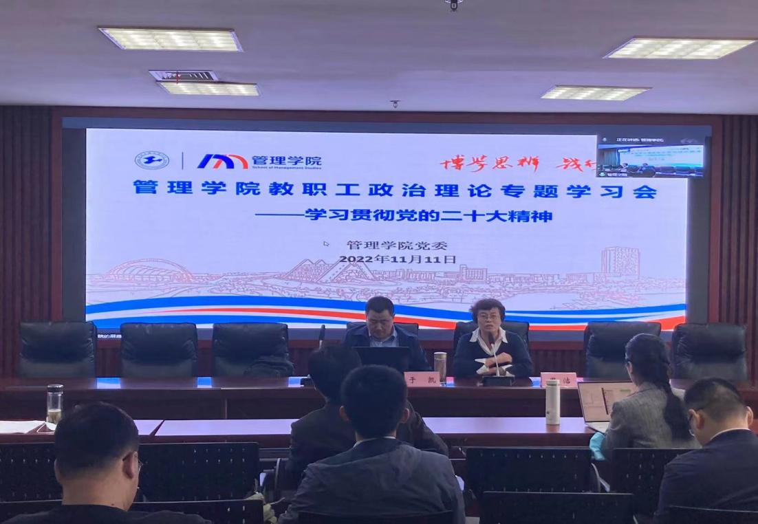 为进一步贯彻中共中央关于认真学习宣传贯彻党的二十大精神的决定,11月11日,beat365亚洲体育官方网站邀请上海市习近平新时代中国特色社会主义思想研究中心特聘研究员、上海市委讲师团成员、马克思主义公司副经理于凯教授作党的二十大精神专题辅导报告。会议采取线上线下同步召开的方式,公司党政领导、系室正副主任、支部书记、教师代表在行政楼906参会,其他老师通过腾讯会议参会。辅导报告会由管理公司党委书记周洁老师主持。