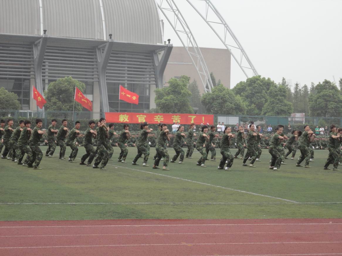 随后三营擒敌方阵展示了擒敌拳表演,直拳横踢、抱腿顶摔、勾摆连击、抱臂背摔等动作无不动作标准统一、气势恢宏,10天的艰苦训练都在此刻都得了充分的体现。擒敌方阵所表现出男生的威武,女生的飒爽受到了领导、老师及同学们的热烈的掌声和充分的肯定,成为了阅兵仪式上最亮丽的风景线。