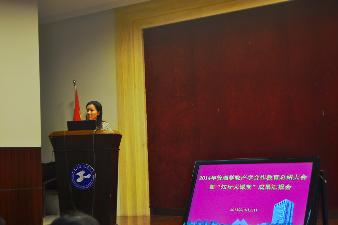 社会实践项目代表成碧雯同学介绍了“重走丝绸之路,关注生态文明”的社会实践,她们的团队“聚焦深化改革”,将目光投向沙乡民勤,将生态改革与新农村建设结合,并且重走丝绸之路,考察体会丝绸之路的灿烂文化,以此来迎接上海老员工暑期社会实践30周年。并讲述团队在甘肃维护沙漠绿洲的经历,呼吁大家尊重环境、敬畏自然、保护生态,树立全新的生态文明核心价值理念。该实践项目获得校级评选的最高分,目前已被选送参加市级评选。他们精彩的分享赢得了在场同学的共鸣与掌声。