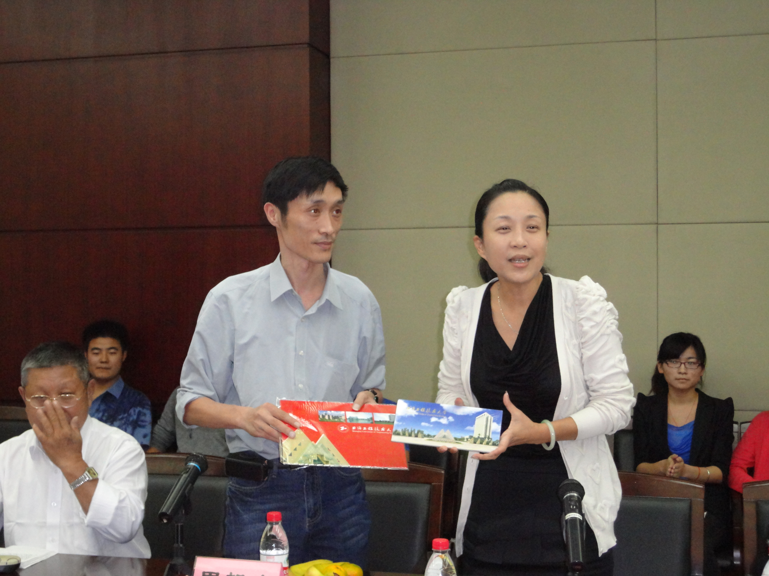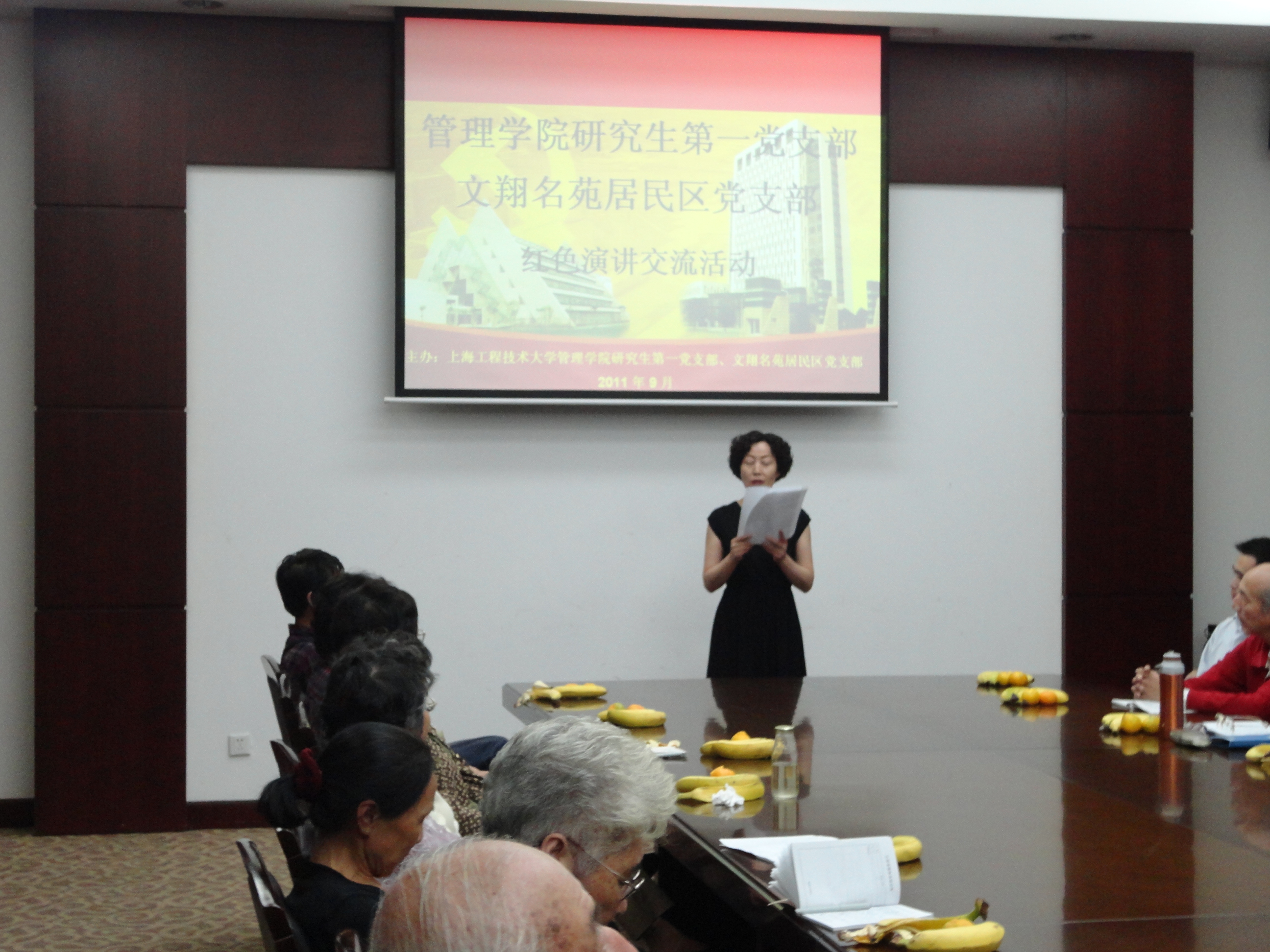 管理公司党委副书记虞蓉老师首先热烈欢迎了文翔名苑居民区党支部20多位老党员,介绍了公司、公司及研究生党支部建设的基本情况,阐述了支部共建的活动的意义,殷切希望双方的沟通交流能够延续下去,以 “牢记身份、明确责任、践行表率”12字要求勉励党员,并向文翔名苑居委会党支部赠送了纪念品。