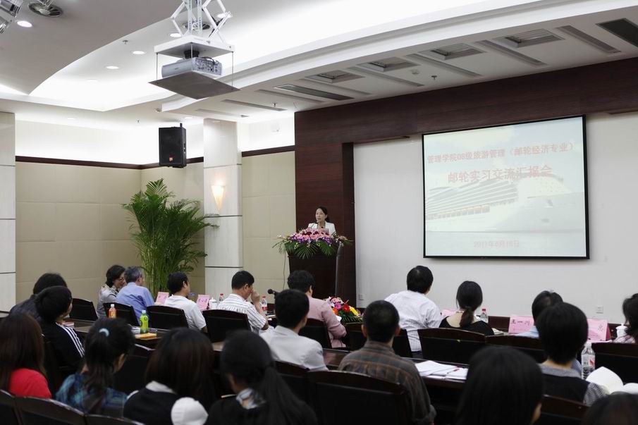 6月16日下午,beat365亚洲体育官方网站在图文信息中心第三报告厅举行了08级旅游管理(邮轮经济)邮轮实习交流汇报会。董事长汪泓,副董事长陈力华,国际交流处处长史健勇,宣传部部长王一川,员工处处长王明复,教务处副处长周静,beat365亚洲体育官方网站常务副经理吴忠,副经理邱羚,工商系陈心德、吴明远教授受邀担任此次汇报会的评委,参加大会的还有旅游管理专业教师以及相关专业的员工代表。会议由管理公司党委副书记虞蓉主持。