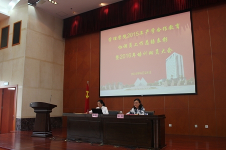 beat365亚洲体育官方网站于6月28日中午在行政楼B301召开了2015年产学合作协调员工作总结表彰暨2016年培训动员大会。管理公司党委书记吴清、副书记范君晖以及本年度产学合作教育协调员教师参加了大会,会议由党委副书记范君晖老师主持。
