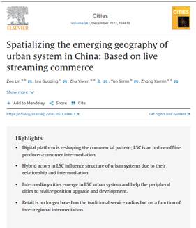 近期,beat365亚洲体育官方网站教师邹琳在数字经济与城市体系重构研究领域收获最新成果。相关成果“Spatializing the emerging geography of urban system in China: Based on live streaming commerce”发表于城市规划学、城市地理学的国际权威期刊《Cities》(中科院分区SSCI一区,JCR城市研究类TOP2)。