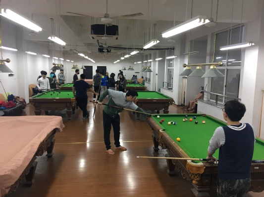 12月20日下午16:40,由beat365亚洲体育官方网站体育部主办的菁英杯美式8球公开赛在师生活动中心3楼桌球房拉开帷幕。本次比赛是初赛的第一场,由张诗佳同学对战刘佳诚同学。在比赛开始前,选手们就早早地来到桌球房进行赛前练习,整个桌球房里洋溢着青春的律动。