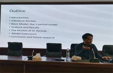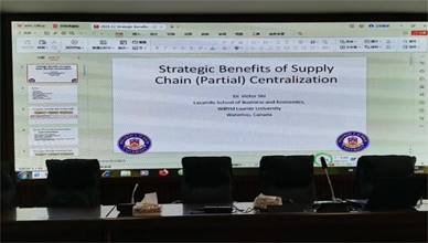Dr. Chungming Shi firstly introduced the basic information of Lazaridis School of Business at Laurier University in Canada. He then explained in detail the strategic benefits of (partial) supply chain decentralization, including literature review, basic model, model extension and thesis conclusions and future research.